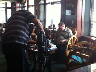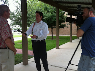 Jack Carter then excused himself for a moment to clear his head. Christina, Donovan, and I waited for Don Flanary, who was still speaking to The Today Show in the next room. Christina told me then that sometimes, the best sound bites- the ones with raw emotion- come after the interview ends. She stressed the importance of keeping the camera rolling in those situations. Don Flanary finally entered the lobby not too much later, and we sat down with him in the same lobby (mainly because The Today Show wanted to interview Carter in the same room that they interviewed Flanary.) We rearranged the setup so the interview didn't have the same background. I held the responsibility of holding the stick mic again and listened as Flanary discussed his opinion about the bond amount. He replied that he had murder clients whose bonds are set to only $100,000. Flanary also said he took on the case that only two days before, mainly because the other lawyers that looked at the case couldn't come up with the bond amount (hence Carter's decision to contact national media). Another fact we learned was that an anonymous source in Canada saw the comment and contacted the Austin Intelligence Agency, which prompted Carter's arrest. He spoke of a court hearing on July 16, and of his efforts to lower the bond or to eliminate it completely.