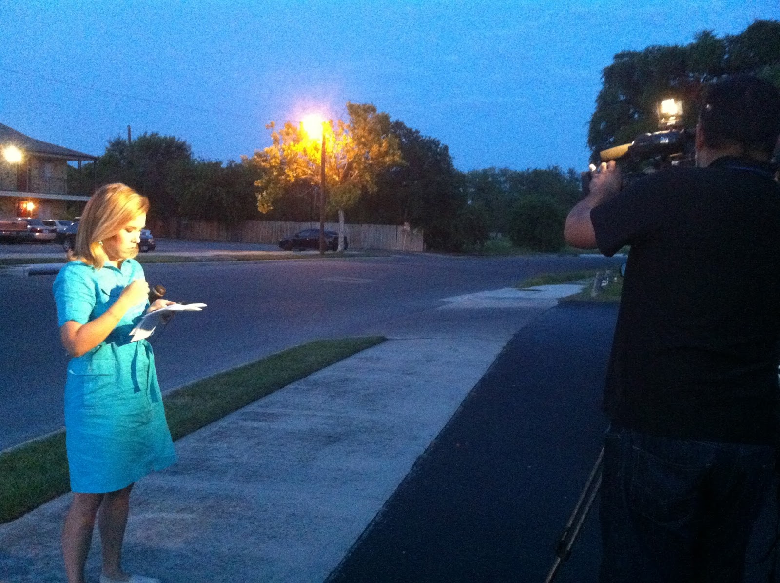 Time passed as I watched Grace write her script for her package as well as AP style for the website. At 8:00 we left the station once more and drove to Palacios' house for the live shot. Since we were taking the Live-U instead of a live truck, we faced a brief situation with lighting. Darkness surrounded all of Espada Rd., but we found additional and sufficient lighting with the high-beams of the car. I also assisted with holding the cords to the Live-U as Donovan placed the cameras at angles where Grace could showcase the same watermark I performed my standup with. It turned out that we were in the first block of the newscast, so after Grace did her part, we headed back to KABB. Grace and I talked over the day's events with a sense of accomplishment.
