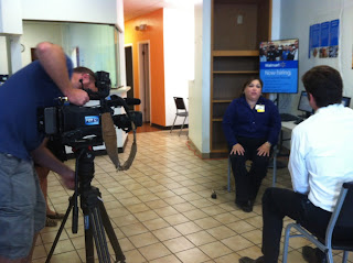 Our next stop was the Wal-Mart hiring center, located near the new store's Culebra Rd. location. The suite appeared to be closed, mainly because it wouldn't be open to the public until later next week. We spoke to the new manager, Sandra Ponce, about the store, which is expected to hire about 200 people. She told us that potential employees can apply online and through the center. After speaking with Ponce, we checked out the store's construction site. The station wanted both B-roll footage, and for Robert and Justin to go back to that area live later that night.